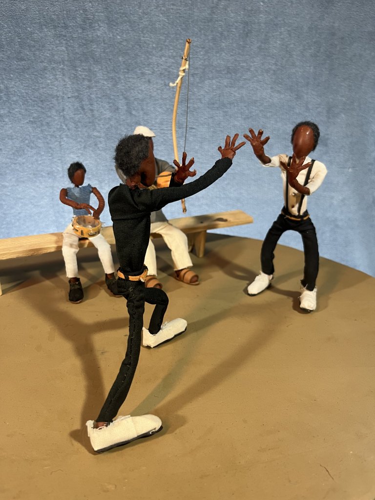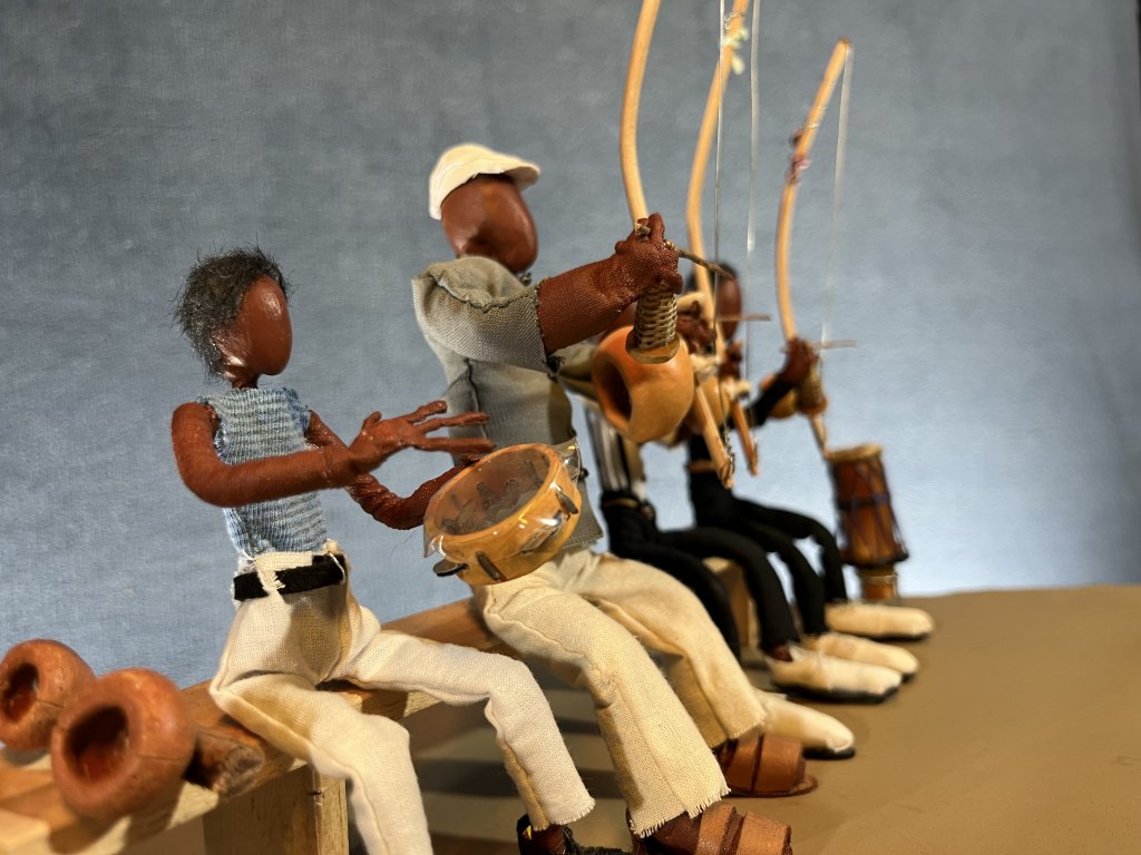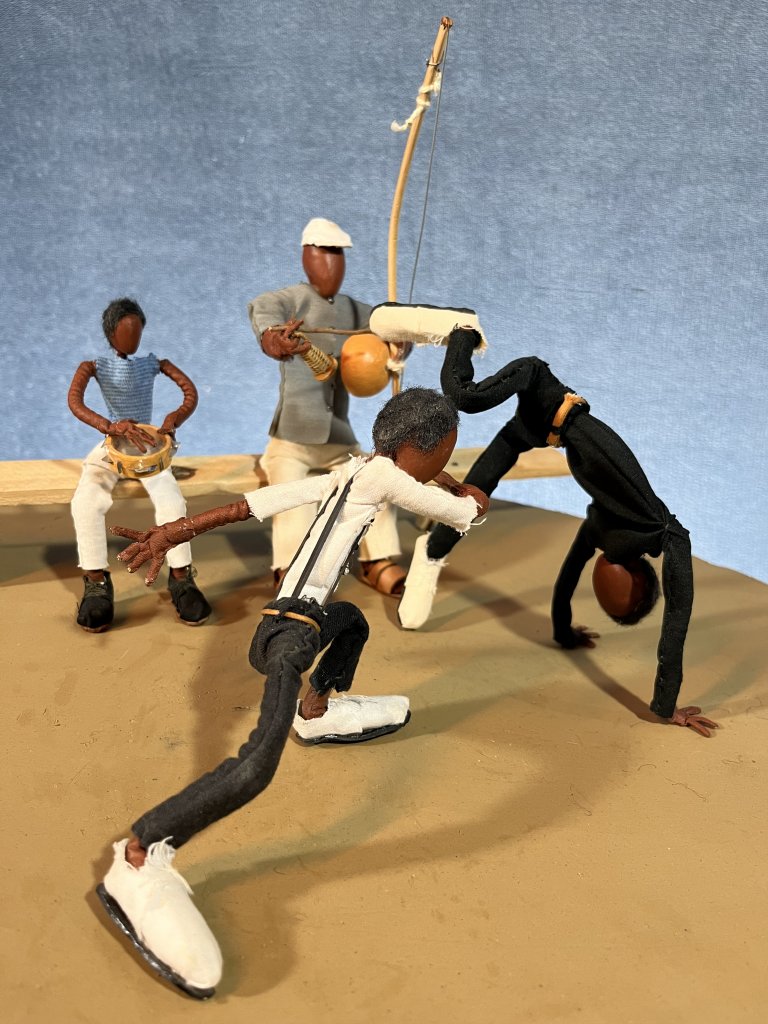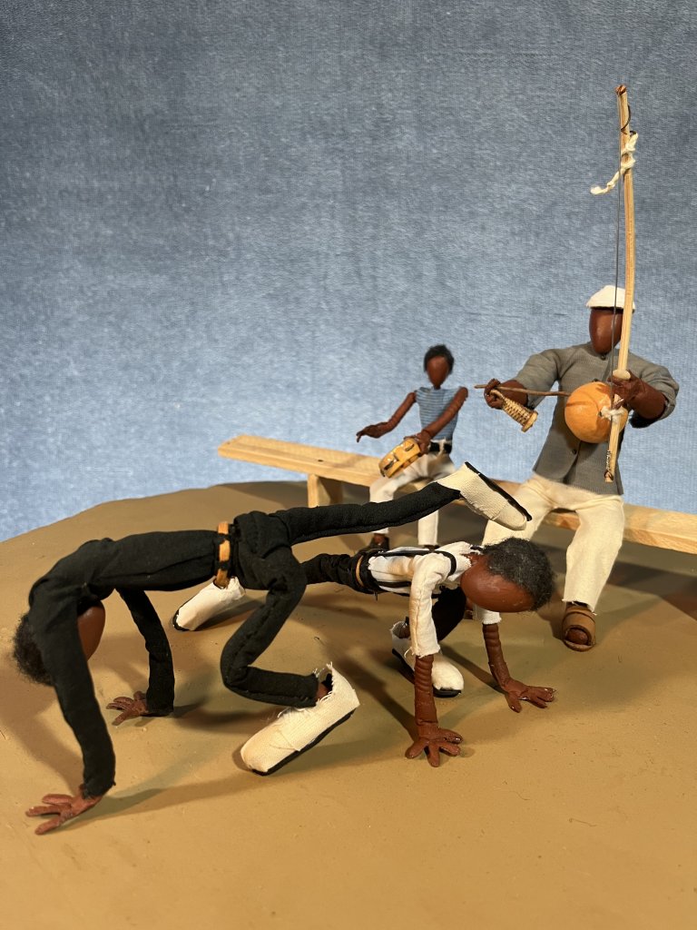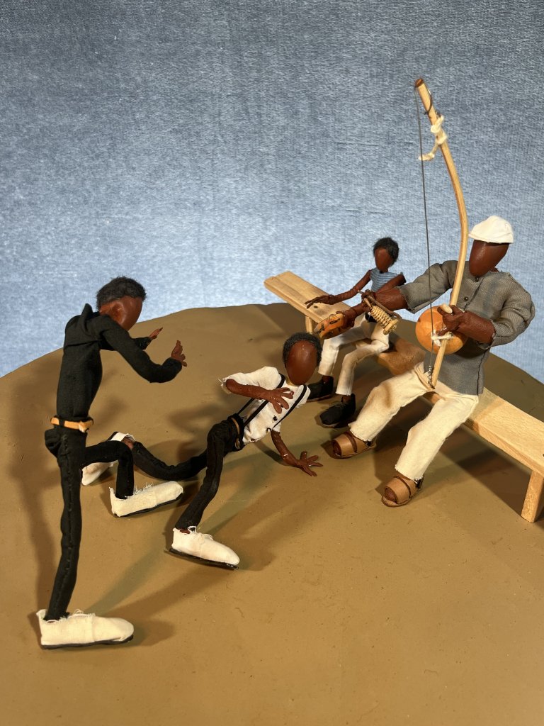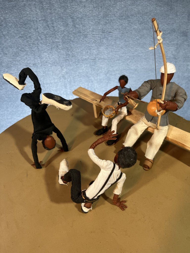 Angola Pequena é um ensaio fotográfico representando a Capoeira Angola a partir de miniaturas de capoeiristas e dos instrumentos musicais. Traçando um paralelo das miniaturas com a própria Capoeira que praticamos, é um estudo, em escala reduzida, de movimentação, história e luthieria. Inspirado na vivência com o ProCAEP e demais espaços da Capoeira Angola, o ensaio tenta traduzir as memórias do corpo em uma alegoria que une os tempos passados, presente e futuro. A pesquisa com as miniaturas começa com o curta “Feito Cobra Pelo Chão”, um stop motion retratando a roda de Capoeira Angola e que já traz parte das peças usadas no ensaio. Angola Pequena propõe um novo desdobramento dos experimentos com miniaturas, dessa vez com imagens estáticas.
