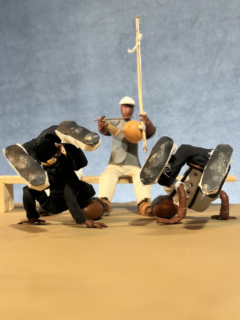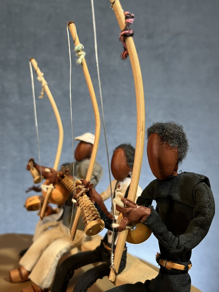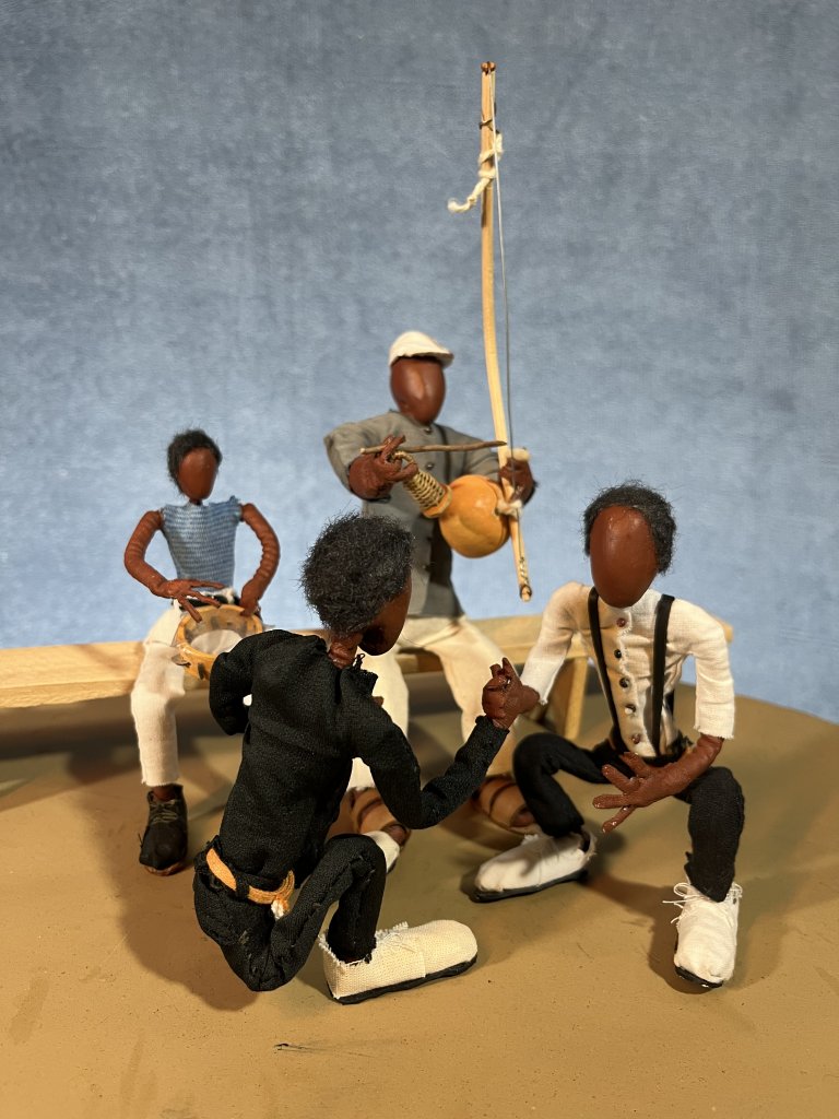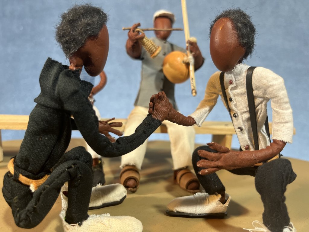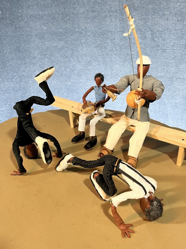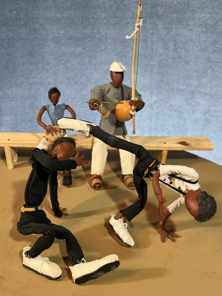 Angola Pequena é um ensaio fotográfico representando a Capoeira Angola a partir de miniaturas de capoeiristas e dos instrumentos musicais. Traçando um paralelo das miniaturas com a própria Capoeira que praticamos, é um estudo, em escala reduzida, de movimentação, história e luthieria. Inspirado na vivência com o ProCAEP e demais espaços da Capoeira Angola, o ensaio tenta traduzir as memórias do corpo em uma alegoria que une os tempos passados, presente e futuro. A pesquisa com as miniaturas começa com o curta “Feito Cobra Pelo Chão”, um stop motion retratando a roda de Capoeira Angola e que já traz parte das peças usadas no ensaio. Angola Pequena propõe um novo desdobramento dos experimentos com miniaturas, dessa vez com imagens estáticas.